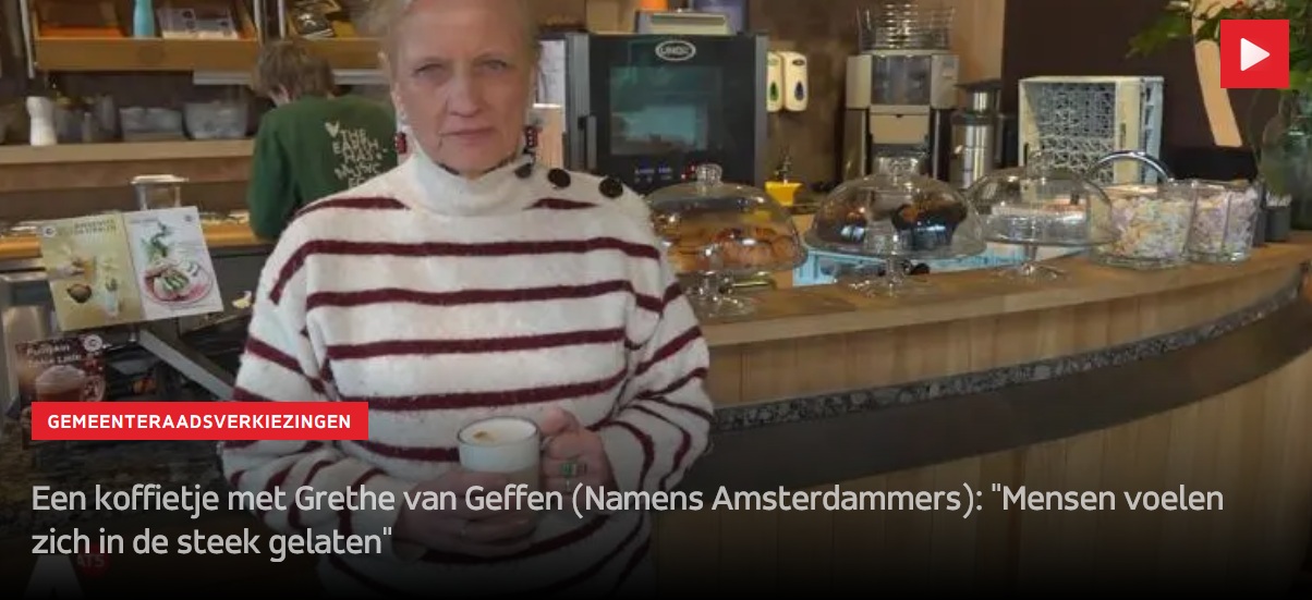 19 februari: AT5 doet een koffietje met lijsttrekker Grethe van Geffen. Bekijk hier het artikel en de video van AT5.